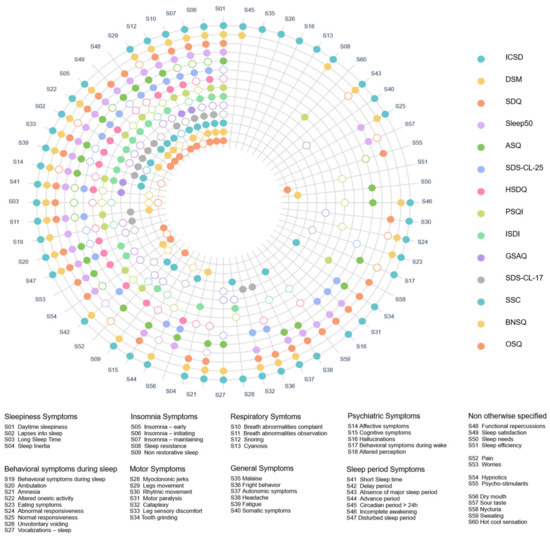Content overlap of sleep symptoms in the 12 selected self-reported multiple sleep disorder screening questionnaires. Colored circles for a symptom indicate that this is a specific symptom, while empty circles indicate that this is a compound symptom. See also the interactive version of this Figure online: https://chart-studio.plotly.com/~vincent.martin/23/#/ accessed on 27 December 2022. ICSD: International Classification of Sleep Disorders, DSM: Diagnostic and Statistical Manual of Mental Disorders, SDQ: Sleep Disorder Questionnaire, ASQ: Auckland Sleep Questionnaire, HSDQ: Holland Sleep Disorders Questionnaire, SDS-CL-25: Sleep Disorder Symptom Checklist 25, PSQI: Pittsburgh Sleep Quality Index, ISDI: Iowa Sleep Disturbances Inventory, GSAQ: Global Sleep Assessment Questionnaire, SDS-CL-17: Sleep Disorder Symptom Checklist 17, SSC: Sleep Symptom Checklist, BNSQ: Basic Nordic Sleep Questionnaire, OSQ: Oviedo Sleep Questionnaire.