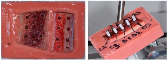 Fresh bovine rib was used, and the dental implants were inserted according to the indications of the commercial company. The bone type was determined by a scanning electron microscopy observation of the cortical and cancellous bone tissue zone obtaining class 2. The confirmation of this classification was performed by means of a Matzsusawa microhardness tester (Tokyo, Japan), which realized 15 microindentations in the cortical place of the bovine bone by applying 500 gf for 15 s with a Vickers indenter. The values obtained were 205 ± 19 MPa, which was classified as type 2 bone density [38].