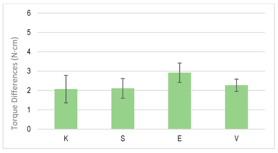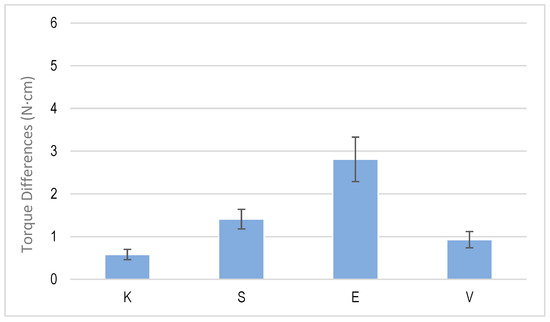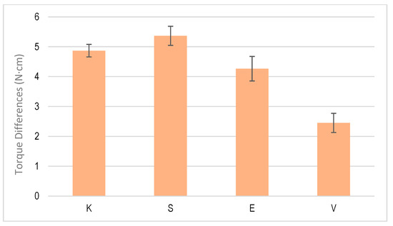Torque differences for the cyclic test of tightening and untightening torque for each dental implant system.