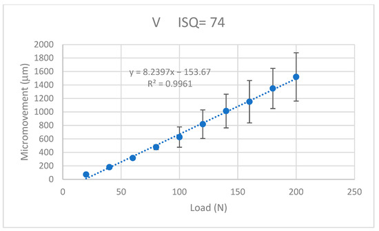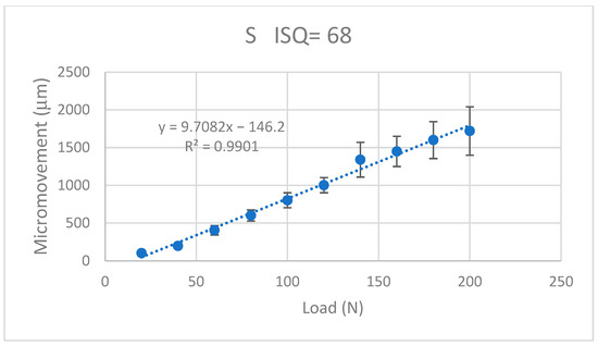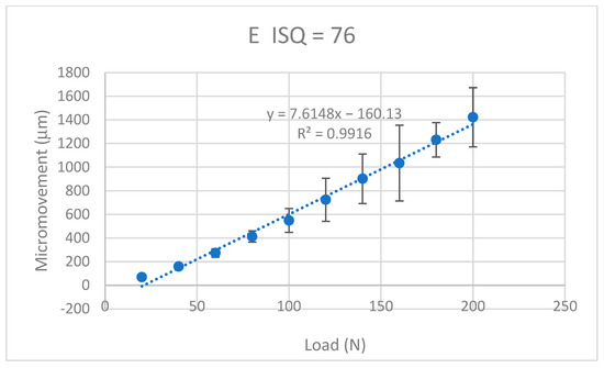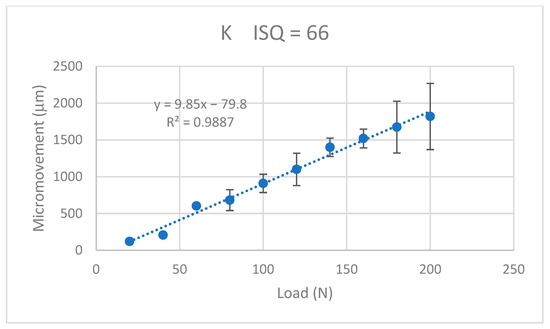 The values of the micromotion for each of the dental implants were obtained when a progressive load of 20 N was applied. It was observed that in all the systems, it increased in a linear way with the applied load and the micromotions were smaller when the ISQ was higher. The results for the K implants are shown in Figure 9, for the S implants in Figure 10, for the E implants in Figure 11, the results for the V bone level implants are shown in Figure 12.