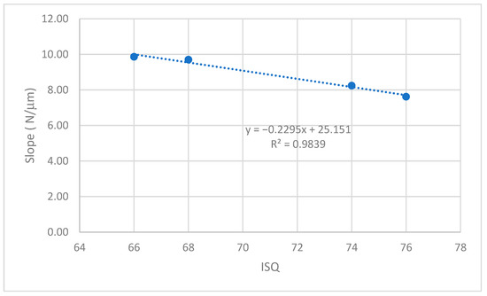 Relationship between the slope of the linear equation (micromovement-applied load) versus ISQ.