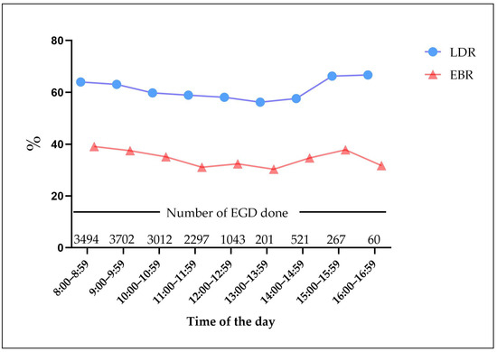 LDR and EBR as time progressed. The number of EGD corresponding to each hour denotes the total number of EGD conducted during that hour. EGD, Esophagogastroduodenoscopy; LDR, lesion detection rate; EBR, endoscopy biopsy rate.