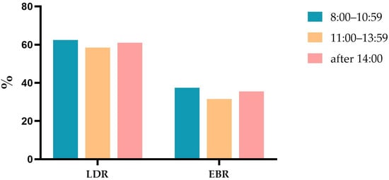 The quantitative variables were presented as the median and interquartile range (IQR). Numbers and percentages were used to present qualitative variables. A Wilcoxon-Mann-Whitney U test was used to compare the continuous variables. A chi-squared test was used to compare the categorical variables. Tests for the LDR and EBR between groups were performed using the chi-squared test. Bonferroni correction was used for pairwise comparison between groups. Binary logistic regression was used to calculate the unadjusted odds ratios (ORs) and 95% confidence intervals. The mantel-Haenszel test was performed to analyze the influence of time on the LDR and EBR. Univariate and multivariate analyses were utilized to evaluate whether the start time can predict the LDR and EBR. Spearman correlation was carried out to measure the association between the EBR and LDR. All of the analyses were performed using the Statistical Package for the Social Sciences, version 23.0 (SPSS, Chicago, IL, USA). A p value < 0.05 indicated statistical significance, and a p value < 0.0167 was considered as statistically significant for the Bonferroni correction.