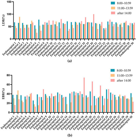 Comparison of individual endoscopist’s LDR and EBR in three shifts. (a) The comparison of individual endoscopist’ LDR; (b) The comparison of individual endoscopist’ EBR. LDR, lesion detection rate; EBR, endoscopy biopsy rate.