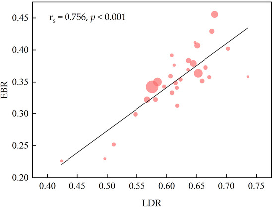 The association between EBR and LDR. Each circle represents a single endoscopist’s performance and the diameter of the circle represents the number of esophagogastroduodenoscopies performed by the endoscopist. LDR, lesion detection rate; EBR, endoscopy biopsy rate; rs, Spearman correlation.