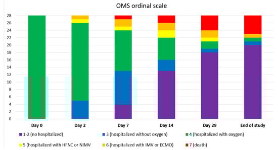 Clinical status according to OMS ordinal scale of COVID-19 severity at different days after sotrovimab infusion. Day 0 equals the day of sotrovimab infusion.