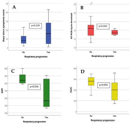Quantitative variables value at time of sotrovimab infusion in patients with and without respiratory progression. The bar limits represent the interquartile range (p25 and p75). The black line within the bar represents the median. The lines that are external to the bar represent range (minimum–maximum). Comparison was made by means of Mann–Whitney’s U. A: Days since symptoms onset; B: RT-PCR cycle threshold; C: SaFi; and D: PaFi.