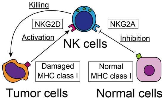 Among the activating receptors are the Fc receptors CD16 and CD62, which recognize specific antibodies attached to tumor cells. Through these Fc receptors, NK cells can exert efficient cytotoxic activity against antibody-coated tumor cells, and this process is called antibody-dependent cell-mediated cytotoxicity (ADCC) []. The other well-known activating receptor is natural killer group 2D (NKG2D), which can detect damaged and stressed cells (Figure 1) []. The receptor detects various tumor cell-related antigens, most of which are a degraded form of major histocompatibility complex (MHC) class I antigens, such as MHC class I chain-related protein A and B (MICA and MICB), UL16-binding proteins in humans, retinoic acid early inducible-1 (RAE1) family protein, and mouse UL-16-binding protein-like transcript 1 (MULT-1) in mice []. Moreover, NKG2D expression is up-regulated by various kinds of cellular stresses [], such as heat shock [] and DNA damage-related antigens []. Through the NKG2D receptor, NK cells detect and eliminate degraded cells under these cellular stresses.