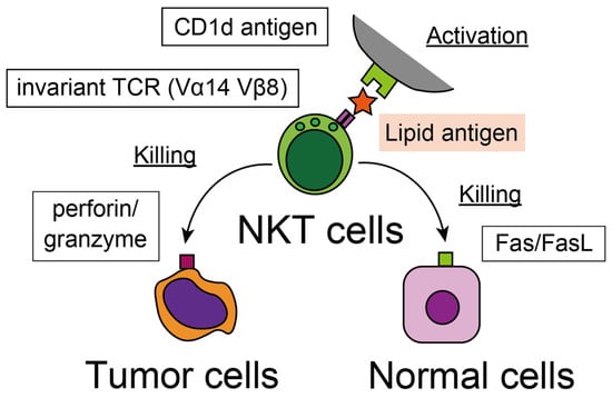 - Kawano, T.; Cui, J.; Koezuka, Y.; Toura, I.; Kaneko, Y.; Sato, H.; Kondo, E.; Harada, M.; Koseki, H.; Nakayama, T.; et al. Natural killer-like nonspecific tumor cell lysis mediated by specific ligand-activated Valpha14 NKT cells. Proc. Natl. Acad. Sci. USA 1998, 95, 5690–5693. [Google Scholar] [CrossRef]