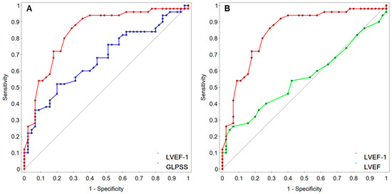Comparisons of AUCs (area under the curve) for LVEF-1 (first-phase ejection fraction) with GLPSS (global longitudinal peak systolic strain) (A) or LVEF (left ventricular ejection fraction) (B).