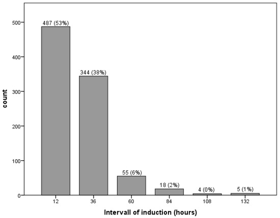 The gestational age was less than 14 + 0 weeks of pregnancy (WoP) in 134 (14.7%) cases. In 362 (39.6%) cases, the gestational age was between 14 + 0 and 19 + 6 WoP, and in 292 (32.0%) cases, it was between 20 + 0 and 23 + 6 WoP. Late termination of pregnancy after 24 + 0 WoP accounted for 125 (13.7%) cases. Median gestational age at induction of labor was 18.9 WoP, ranging from 10 to 37 WoP. In 487 (53.3%) cases women delivered within 12 h after intake of misoprostol. In 344 (37.7%) cases the induction interval was between 12 h and 36 h, and in 82 (9%) cases induction took longer than 36 h (Figure 1).