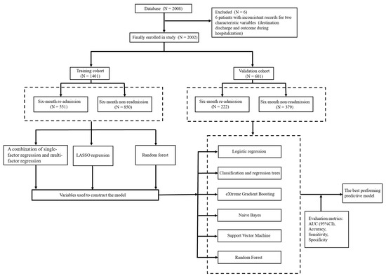 The data used in this study contained data errors and missing data. For the characteristic variables with a missing rate ≥50%, we were unable to include them in the analysis because the missing rates were too large. The remaining missing variables were filled using the k-nearest neighbor (KNN) method, and K was set to 9. Li et al. used a Monte Carlo method to evaluate the effectiveness of different methods for missing value imputation using the average absolute deviation, average relative deviation, and Type Ⅰ error from the regression analysis as evaluation metrics. Their results show that methods such as KNN imputation, the mean imputation, and the random forest perform better [30]. A total of 2002 study participants with 113 variables were included in the analysis after data management, with six-month re-admission being the target predictor variable.