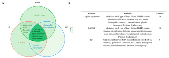 The results of the screening by the three methods are shown below (Figure 2, Figures S1–S4). Combining the results of the three approaches, we consider the following 12 variables: admission ward, type of heart failure, NYHA cardiac function classification, diabetes, uric acid, mean hemoglobin volume, glomerular filtration rate, platelet count, basophil count, platelet hematocrit, D dimer, and discharge day as predictor variables strongly associated with outcome for modeling analysis.