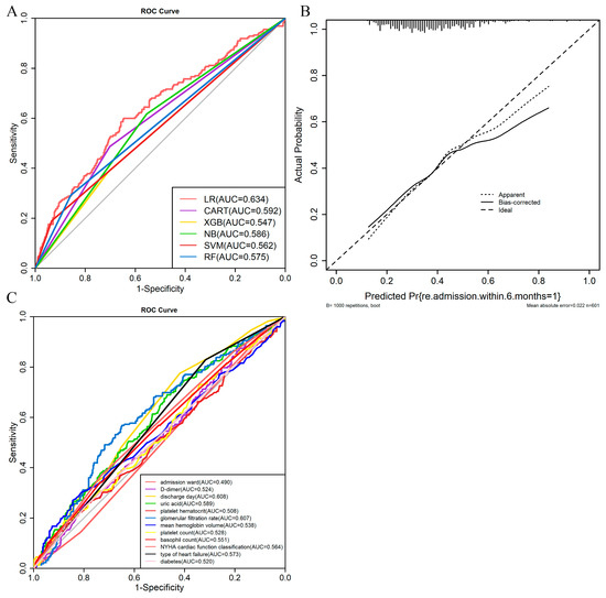 The prediction results of the six machine learning algorithms are shown in Table 1. Comparison of the AUC of six machine learning algorithms is shown in Figure 3A. From the table, we can see that the AUC of the LR model is the highest at 0.634, the remaining five models are worse, and the XGBoost model is the lowest at 0.547. From the perspective of prediction accuracy, the LR, SVM, and RF models are better at over or about 65%, CART is 62.2%, and the lowest is NB, only 57.7%. For the sensitivity and specificity, LR, CART, and NB performed better. Combining the above four evaluation metrics, the LR algorithm is considered to be better for the best prediction, with the CART model being the next best. Using stepwise backward regression, the predictor variables in the final LR model were admission ward, type of heart failure, NYHA cardiac function classification, diabetes, uric acid, mean hemoglobin volume, basophil count, platelet hematocrit, D dimer, discharge day, comprising a list of ten. The calibration plot shows good predictive accuracy between the actual (the ideal line) and predicted probabilities (the apparent and bias-corrected lines) (Figure 3B). The results of the ROC analysis for individual variables are shown in Figure 3C and Table S7.