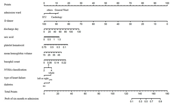 NYHA cardiac function classification, discharge day, uric urea, mean hemoglobin volume, diabetes, and basophil count were associated with higher re-admission risk; when their levels were higher, the patients’ scores were higher. D dimer and platelet hematocrit were associated with lower re-admission. Length of stay in the hospital was also positively associated with the risk of six-month re-admission in HF patients. There was a higher risk of six-month re-admission for patients from the department of cardiology, general ward, and others compared to the intensive care unit (ICU).