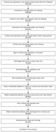 Critical care episodes were excluded if patients were discharged to palliative care; transferred to another ICU; lived in Wales for less than 12 months before critical care admission; had missing critical care admission or discharge dates, discharge status, or socioeconomic data; or had low-quality record linkage within SAIL. Only the first admission to critical care was included for each identified patient.