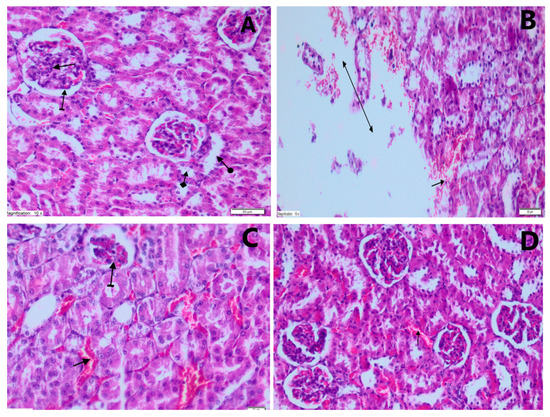 Serum creatinine (sCr) and blood urea nitrogen (BUN) levels were determined using COBAS Integra 800 analyzer (Roche, Schaffhausen, Switzerland). Oxidative stress biomarkers were measured in the animals’ renal tissues as previously described using renal tissue homogenate (diluted 1:2) [28]. Total plasma protein was determined using a Bradford reagent (Sigm, Rockville, USA). More specifically, malondialdehyde (MDA) was measured in 532 nm wavelength and the pink complex formed at a high temperature (95 °C) based on spectrophotometric measurement [29]. The total glutathione (tGlu) assay (yellow color) was measured at 412 nm wavelength [30]. Glutathione peroxidase (GPO) and Glutathione reductase (GR) activity were determined at 340 nm wavelength (Lawrence and Burk for GPO and Carlberg and Mannervik for GR were used) [31,32]. Rat kidneys were removed immediately after sacrifice. They were fixed in neutral formalin 10% (Sigma, Rockville, USA) solution for 24 h, then embedded in paraffin wax and sectioned (4 µm thickness) for histopathological assessment. Renal tissue sections were stained with hematoxylin and eosin (H and E stain) using a standard protocol and were evaluated under light microscopy [33,34,35].