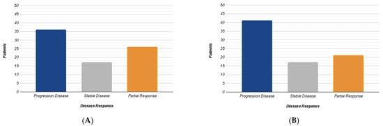 The diagrams summarize the results obtained from the RECIST 1.1 dimensional analysis (A) and those from iodine concentration variation (B) according to three different groups (Progression, Stability, Response).