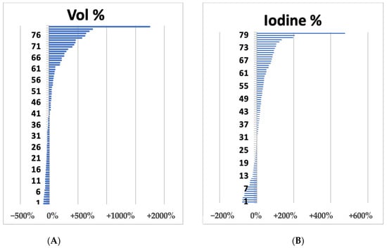 The volumetric changes ranged from +1798% to −95%, while the range of variation of the intralesional iodine concentration ranged from +478% to −79% (Figure 2).