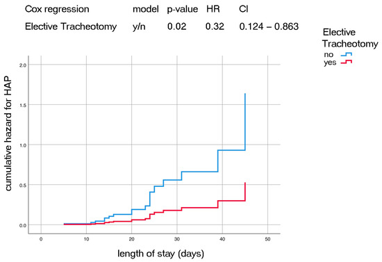 We investigated the occurrence of HAP in patients with elective tracheotomy using Cox regression analysis for hazard ratio (Figure 1, Table 4) and found that the risk for developing HAP decreased for patients with elective tracheotomy over total length of hospitalization (HR 0.32, p = 0.02, CI = 0.124–0.863).