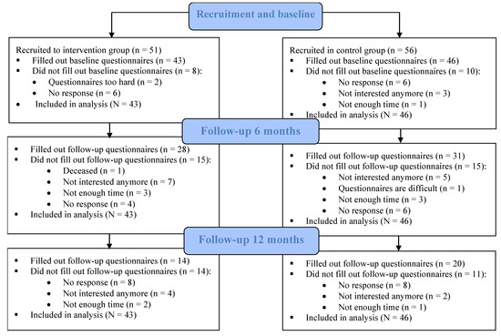 In total, 107 participants were recruited for the study. Of them, 89 filled out the baseline questionnaire (43 in the intervention group; 46 in the control group) and were included in the study (Figure 1).
