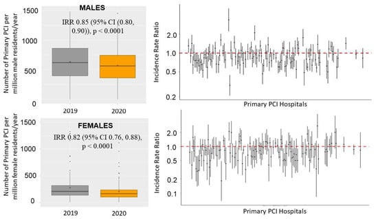 Among women, the number of STEMI patients treated percutaneously per million residents had a consistent reduction, on average, from 277 (95% CI 245–312) in 2019 to 223 (95% CI 195–254) in 2020 (IRR 0.822 (95 % CI 0.764, 0.885) < 0.0001) (Figure 1 and Figure S2).