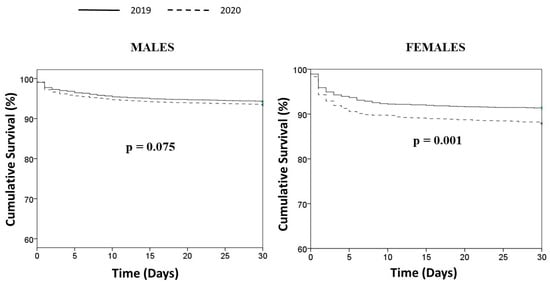 A significantly higher in-hospital mortality rate was observed in 2020 compared to 2019 in females (10% vs. 6.9%, OR [95% CI] = 1.44 [1.17–1.78], p < 0.001), but not in male patients (4.7% vs. 5.4%, OR [95% CI] = 1.14 [0.98–1.34], p = 0.086) (Figure 2) (p interaction = 0.069). The mortality rates were extremely high among COVID-19-positive patients (n = 109: 80 males and 29 females), especially among males (28.8% vs. 4.9%, p < 0.001) compared to female patients (17.2% vs. 8.3%, p = 0.081) (p interaction = 0.022).