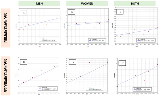 As can be seen in Table 2 and Table 3, there has been an increase in PD coding as primary diagnosis in Spanish hospitalizations. This increase is represented in both sexes with a predominance in males (male population 3.81 vs. 4.41 per 100,000 inhabitants; female population 2.98 vs. 3.25 per 100,000 inhabitants). The results of the joinpoint analysis (Figure 1) showed that the admissions of patients with PD in a primary diagnosis position increased by 1.26% per year in both sexes, but this rise was only statistically significant in men (1.58% per year, p < 0.05).