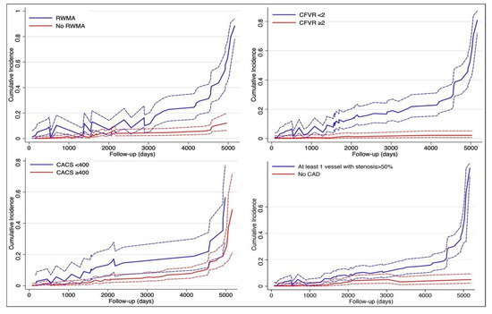 Figure 2, lower panel). The cumulative incidence was only slightly higher in presence of RWMA, CACS > 399, or stenosed coronary arteries, but was instead markedly higher for patients with reduced CFVR, as visually evident.