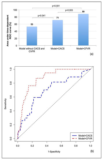 All variables with p < 0.1 at univariable analysis were considered for the inclusion into multivariable models. Proportional hazards assumption was evaluated using visual inspection of the log–log survival curves and the Schoenfeld residuals test. Time-dependent ROC curves and estimated areas under the curve (AUCs) were calculated to assess the accuracy of variables identified in the multivariate analysis not including and including CACS or CVFR.