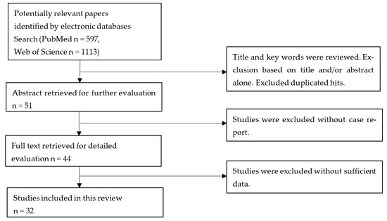 PubMed and Web of Science databases were searched for articles published after 2000, using the following terms: (“Guillain-Barré syndrome” or “GBS”, “Inflammatory Demyelinating Polyneuropathy” or “paralysis”, “Acute motor axonal neuropathy”, “Miller-Fisher syndrome” or “ataxia and nystagmus”) and (“Human Immunodeficiency Virus” or “HIV” or “AIDS” or “immune reconstitution”). The language of articles was limited to English. Studies with reported cases were included, while studies with incomplete data or without reported cases were excluded (Figure 1). Direct drug toxicity, such as stavudine-associated GBS-like manifestation, was excluded [2,3,4,5]. Finally, a total of 41 cases from 32 studies were included. The date of completion of the data collection was 1 November 2022.