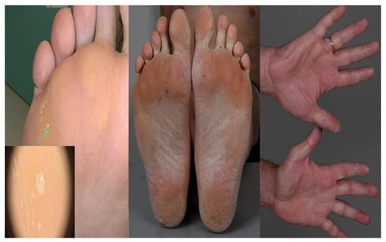A 58-year-old man with a history of cardiomyopathy of unknown etiology was presented to our outpatient clinic for genetic counseling. His vital signs were unremarkable (heart rate 50 bpm, arterial blood pressure 103/84 mmHg). There were no signs of congestive heart disease, but a thorough physical examination revealed skin abnormalities located on the hands, feet, and knees (Figure 1), which were previously suspected to be psoriasis lesions.