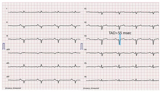 Except for terminal activation duration delay (TAD) in V1–V3, the resting 12-lead ECG (Figure 3) does not meet the typical ACM nor arrhythmogenic right ventricular cardiomyopathy (ARVC) characteristics according to the 2010 ARVC Task Force (TFC) [4] and 2020 Padua criteria [5].