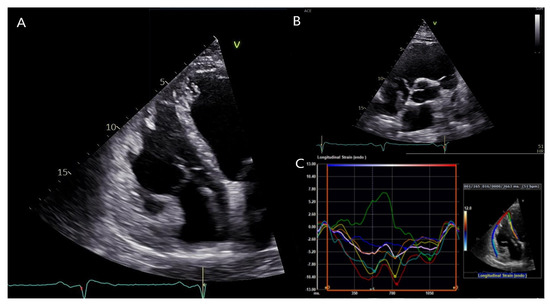 Transthoracic echocardiography of the patient showed a dilated left ventricle (LV) with moderately reduced ejection fraction (EF), akinesia of the LV inferolateral segments together with hypokinesia of the remaining segments, severe RV dysfunction with dilatation of the RV/RVOT, and akinesia of the free wall. (Figure 4 and Video S1), fulfilling both major criteria from the 2010 TFC and 2020 Padua criteria [4,5]. Both left and right ventricular global longitudinal strain were notably impaired (−11.5 and −7.0%, respectively). Similarly, the RV free wall strain was impaired (−7.7%).