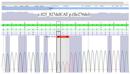 We performed positron emission tomography (18F-FDG PET/CT) and excluded sarcoidosis, a common differential diagnosis of ACM [6]. The patient’s skin lesions were also examined and cardiocutaneous syndrome (CCS) composed of ACM and palmoplantar keratosis was suspected. A skin sample taken from the plantar area indicated severe hyperkeratosis excluding psoriasis. Despite a previously negative genetic test and a negative family history, due to the high probability of CCS and incomplete NGS panel only including PKP2, DSG2, DSP, DSC2, JUP, TGFB3, TMEM43 and LMNA performed abroad, we opted for repeat genetic testing using a custom cardiogenetic panel covering 173 genes (Agilent, Santa Clara, CA, USA, SureSelectQXTTarget Enrichment) and NGS (Illumina MiSeq). We additionally used multiplex ligation-dependent probe amplification (MLPA, MRC Holland, Amsterdam, The Netherlands) for DSC2, DSG2, DSP, JUP, PKP2, phospholamban (PLN), TGFB3, and ryanodine receptor 2 (RYR2). In the second genetic test, we identified a novel heterozygous single amino acid deletion variant localized in the domain in exon 7 of the DSP gene that interacts with plakoglobin (Figure 5), which was confirmed by Sanger sequencing. This deletion variant DSP (NM_004415.4):c.825_827del (p.Ile276del) has not yet been described in the literature and is currently classified by the American College of Medical Genetics criteria as a variant of unknown significance (class III).