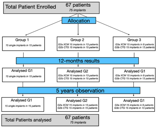 The present study is a long-term observational study. The study was performed in the Wroclaw Medical University Dental Clinical and Teaching facility. The study protocol of the original randomized control trial (RCT) was approved by a local ethical committee (registration number No. KB-217.2012); the RCT was registered under the clinical trial registration number NCT04243460 (ClinicalTrials.gov). A total of 67 patients (42 women and 25 men) aged between 18 and 60 years participated in the original study; all the patients gave two written consents: the first was a general consent to have dental implants placed, and the other consent involved participation in the study. The study was conducted in full compliance with the Declaration of Helsinki. A protocol for this follow-up required a new bioethics committee approval that was granted (registration number 861/2021). The details on the specific inclusion and exclusion criteria, the exact clinical procedures and the 12-month data were reported in our previous publications [6,7].