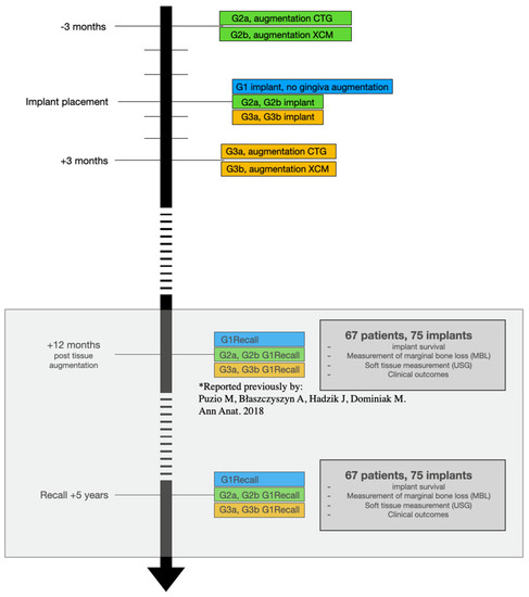 - Puzio, M.; Błaszczyszyn, A.; Hadzik, J.; Dominiak, M. Ultrasound assessment of soft tissue augmentation around implants in the aesthetic zone using a connective tissue graft and xenogeneic collagen matrix—1-year randomised follow-up. Ann. Anat. 2018, 217, 129–141. [Google Scholar] [CrossRef] [PubMed]