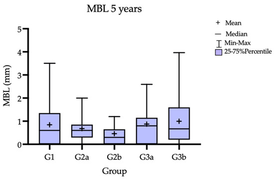 The 12-month results are presented in a previous publication [6]. At the 5-year follow-up, the MBL for all the groups are presented in Table 1 and Figure 3