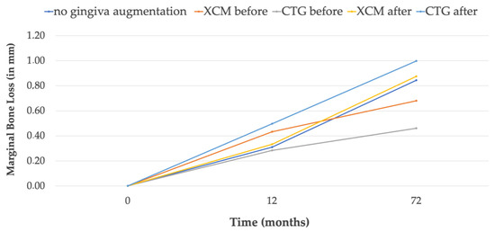 Gradually, progressive bone loss was observed in all the groups throughout the observation period and can be observed on the simplified chart (Figure 4). The lowest MBL, 0.3 mm, was observed in G2b (CTG treatment performed 3 months prior to the implant treatment); the highest MBL, 0.80 mm, was observed in the G3a (CTG treatment performed 3 months after implantation). Nominally better parameters—lower MBL—were obtained for the groups where the soft-tissue surgery was performed 3 months before the implant insertion. However, the differences between the groups were not statistically significant.