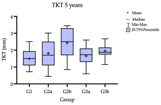 An increase in soft-tissue thickness was observed in all the groups after 12 months, as previously reported [7]. Subsequently, comparing the 12 M and 60 M results, the soft-tissue thickness decreased in all the groups; however, it still maintained a volume above the baseline value (T0). Ultimately, throughout the entire observation period, the greatest increase of 1.035 mm (SD = 0.73 mm) in thickness was observed in G2b (CTG treatment 3 months before implant placement). In both groups where the CTG was used, a greater increase in the soft-tissue thickness compared to the groups with the Geistlich Mucograft was observed after 5 years. In terms of the thickness gain, statistically significant differences were observed for G1 vs. G2b and for G2b vs. G3a and G1 vs. G3b. When comparing the subgroups in terms of the time when the gingival augmentation procedure was performed (3 M pre-implant placement vs. 3 M post-implant placement), better parameters in terms of tissue thickness were observed for the subgroups where the soft-tissue procedure preceded the implantation. The TKT change over time and TKT comparison between the groups are reported in Table 2 and Table 3, and the mean thickness change baseline compared to 60 M in Table 4. Figure 5 presents the TKT after 5 years, Figure 6 shows the trend over the time of observation; Figure 7 presents the mean tissue thickness change—the baseline compared to 60 M.