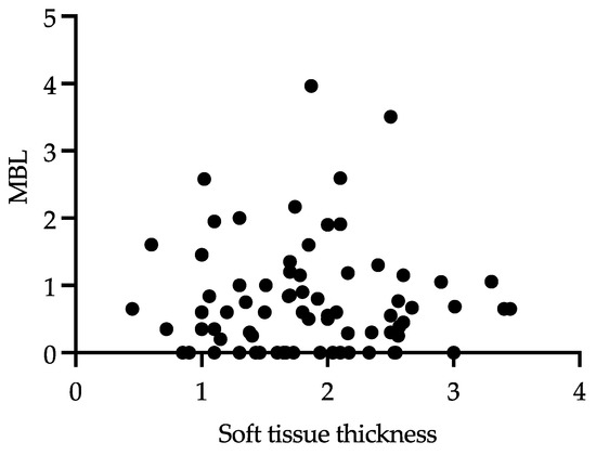 Multiple factors might affect the changes in the MBL, such as smoking habits, diabetes and a history of periodontal disease, which is the reason that, in our study, patients with these conditions were excluded. A progressive MBL around the implant neck is the prelude to peri-implantitis development [22]. Gianfilippo et al. [23], in a recent systematic review, found that the soft-tissue thickness is correlated with the MBL, except in cases of platform-switching implants, when implants with thin tissues and screw-retained prostheses are used. In our study, when analyzing the relationship of the TKT and MBL after 5 years of follow-up, there was no correlation found between MBL and TKT. We believe that this may be due to the fact that most of the patients participating in the study had at least 1.49 mm TKT, so there were no patients with a very thin biotype.