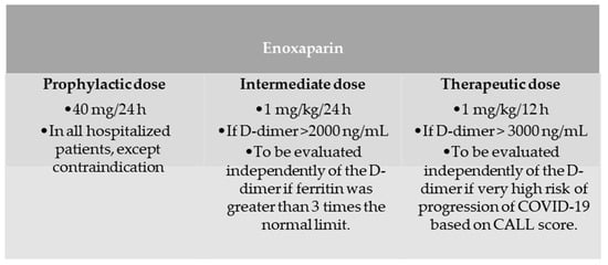 A cohort, retrospective, observational, and analytical study was conducted at the Hospital Universitario of Jerez de la Frontera with patients admitted for SARS-CoV-2 pneumonia (confirmed by a PCR or antigen test) between 1 October 2020 and 31 January 2021 (second and third waves in Spain). Patients were classified according to whether they received prophylactic doses (40 mg/24 h) versus intermediate (1 mg/kg/24 h) and therapeutic doses (1 mg/kg/12 h) of enoxaparin according to our hospital protocol (Figure 1).