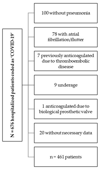 From 1 October 2020 to 31 January 2021, 676 patients were coded on discharge at the Hospital Universitario de Jerez de la Frontera as “COVID-19”, of which 100 patients were admitted to other hospital units due to other pathologies and/or did not present pneumonia, 78 patients presented atrial fibrillation/flutter, 7 patients were previously anticoagulated due to venous thromboembolic disease, 9 patients were underage, 1 patient was anticoagulated due to a biological prosthetic valve, and 20 patients did not have the minimum data necessary for inclusion in the study (Figure 2).
