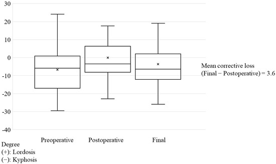 Local kyphosis averaged at 6.7°, 0.1°, and 3.7° at preoperative, postoperative, and last follow-up, respectively, (Figure 2), and significantly improved postoperatively compared with at preoperative conditions (p < 0.0001). At the last follow-up, the mean corrective loss was 3.6°, which was significantly more than that at preoperative conditions (p = 0.023).