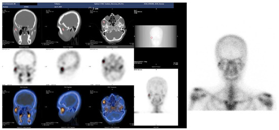 SPET-CT showing bone reworking in correspondence to the joint between the jaw and the right zygomatic bone compared to the contralateral homologous site.