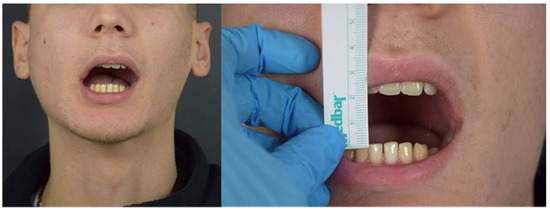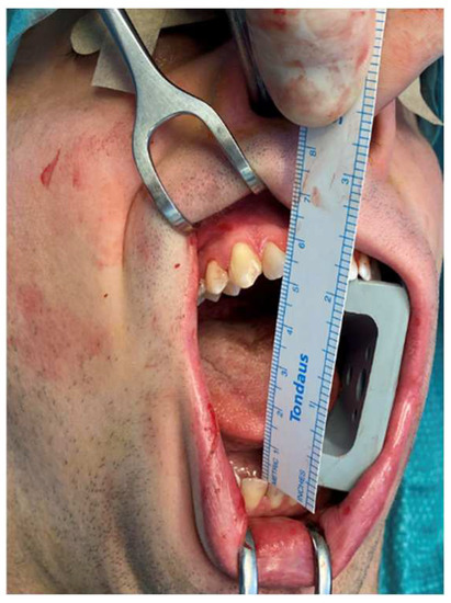 A 23-year-old male patient presented complaining of a progressive limitation in mouth opening. He did not report any pain. The reduction in the MMO had been worsening over the prior 5 years. There was no history of trauma. Clinical examination revealed an MMO of 20 mm with no deviation (Figure 10). There was no pain during jaw opening. He did not experience pain on palpation of the preauricular area bilaterally. The endfeel was rigid but not painful, and crepitus was perceived at the right TMJ. OPG and TMJ projections showed a lack of translation of the mandibular condyles in the opening and an alteration in the morphology of the CPM bilaterally. MRI was negative for intra-articular causes of ankylosis. CT scans showed a bilateral enlargement of the CPMs with a mushroom-shaped bony outgrowth forming a pseudojoint with the inner aspect of the zygomatic bones, which appeared modeled to the CPMs. This is particularly evident in the 3-dimensional dynamic reconstruction for the virtual surgical planning (VSP) we performed before the surgery (Figure 11). The diagnosis was bilateral CPM hyperplasia, determining a bilateral JD. The patient was scheduled for a bilateral endoscopically assisted intraoral coronoidectomy under general anesthesia with awake fiberoptic intubation. Fibrotic shoots were detected at the pseudojoint between the CPMs and the zygoma. The entire CPM was then removed. At the end of the surgery, the interincisal distance was 50 mm with a mechanical forced opening (Figure 12). The resected specimens showed cortical bone tissue with a regular structure and orientation of the bone lamellae, determining a bilateral JD due to a true CPM hyperplasia. Articular physiotherapy was started one week after surgery using TheraBite jaw motion rehabilitation system TM (Atos medical, Padua, Italy). At 1 month after the surgery, the MMO was 25 mm and increasable after forcing, 2 months later it was 30 mm and 35 mm at 3 months. At 14 months follow-up, the patient MMO was stable at 37 mm, and the radiographic evaluation was negative for recurrence.