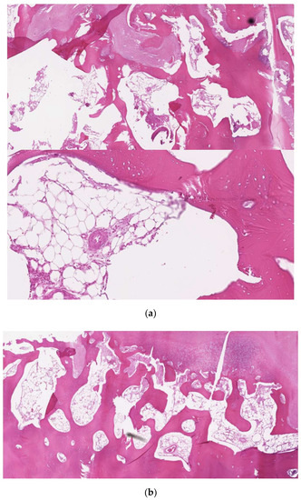Hematoxylin–eosin staining of the lesion. Sections of compact, trabecular bone tissue covered by a layer of hyaline cartilage and fibrous cartilage overlaid by dense fibrous connective tissue (a,b).