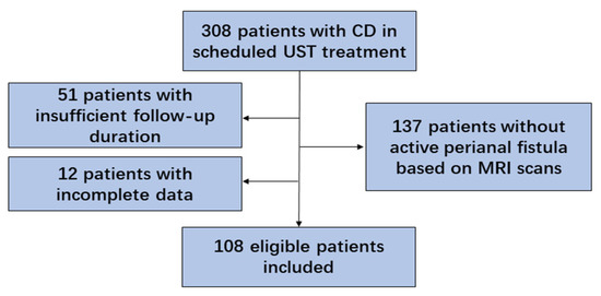 Consecutive patients meeting the following inclusion criteria were included: First, patients underwent comprehensive screening and diagnosis for CD according to internationally accepted criteria [13,14] with supportive clinical, endoscopic, radiological, and histopathological findings. Second, active perianal fistula was confirmed by clinical symptoms and baseline magnetic resonance imaging (MRI). Third, patients were administered UST therapy and followed up until the third infusion at weeks 16 or 20, with a drug interval of q8w or q12w, respectively. Patients with incomplete data, development of severe adverse events, and discontinuation of UST therapy within 16 weeks were excluded.