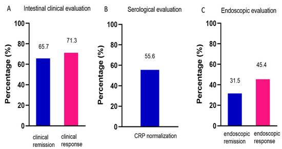 After administration of UST, the patients showed less inflammatory burden manifested by a significant decrease in CRP (14.6 ± 2.4 vs. 24.0 ± 3.2, p = 0.002), and improved nutrition manifested by an increase in hemoglobin (129.8 ± 2.1 vs. 119.0 ± 2.1, p < 0.001) and Alb (40.2 ± 5.7 vs. 36.9 ± 5.1, p < 0.001) (Table 2). Intestinal clinical remission was observed in 65.7% of patients, and intestinal clinical response was observed in 71.3% of patients (Figure 2A). CRP normalization was achieved in 55.6% of patients (Figure 2B). A total of 99 patients had endoscopy reexamination, of whom 22 patients were evaluated by Rutgeerts score and 77 by SES-CD. Endoscopic remission and response were achieved in 31.5% and 45.4% of patients, respectively (Figure 2C).