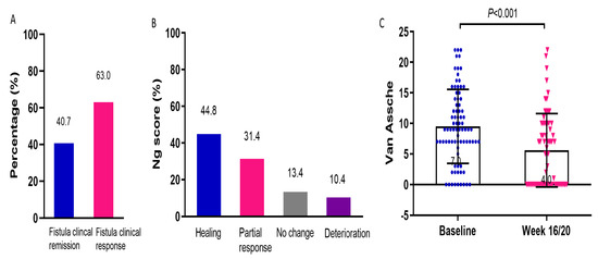 CD was classified using the widely accepted Montreal classification system [16]. Crohn’s disease activity index (CDAI) [17], perianal Crohn’s disease activity index (PDAI) [18], and Crohn’s anal fistula quality of life (CAF-QoL) [19] were evaluated at baseline and at week 16/20. Intestinal clinical remission was defined as a CDAI < 150, and intestinal clinical response was defined as a >70 reduction in CDAI and/or CDAI < 150 [17]. Fistula clinical remission was defined as the absence of any draining fistula, and fistula clinical response was defined as a decrease of >50% in the number of draining fistulas according to the fistula drainage assessment index (FDA) [1]. Rutgeerts [20] scores and simple endoscopic score for Crohn’s disease (SES-CD) [21] were used to evaluate the changes in endoscopic findings in patients with or without colectomy, respectively. Endoscopic remission was defined as a Rutgeerts score ≤i1 or SES-CD ≤2 [20,21]. Endoscopic response was defined as a reduction of one grade from baseline in Rutgeerts score or a reduction of >50% in SES-CD [20,21]. C-reactive protein (CRP) normalization was defined as a CRP level of <4 mg/L.